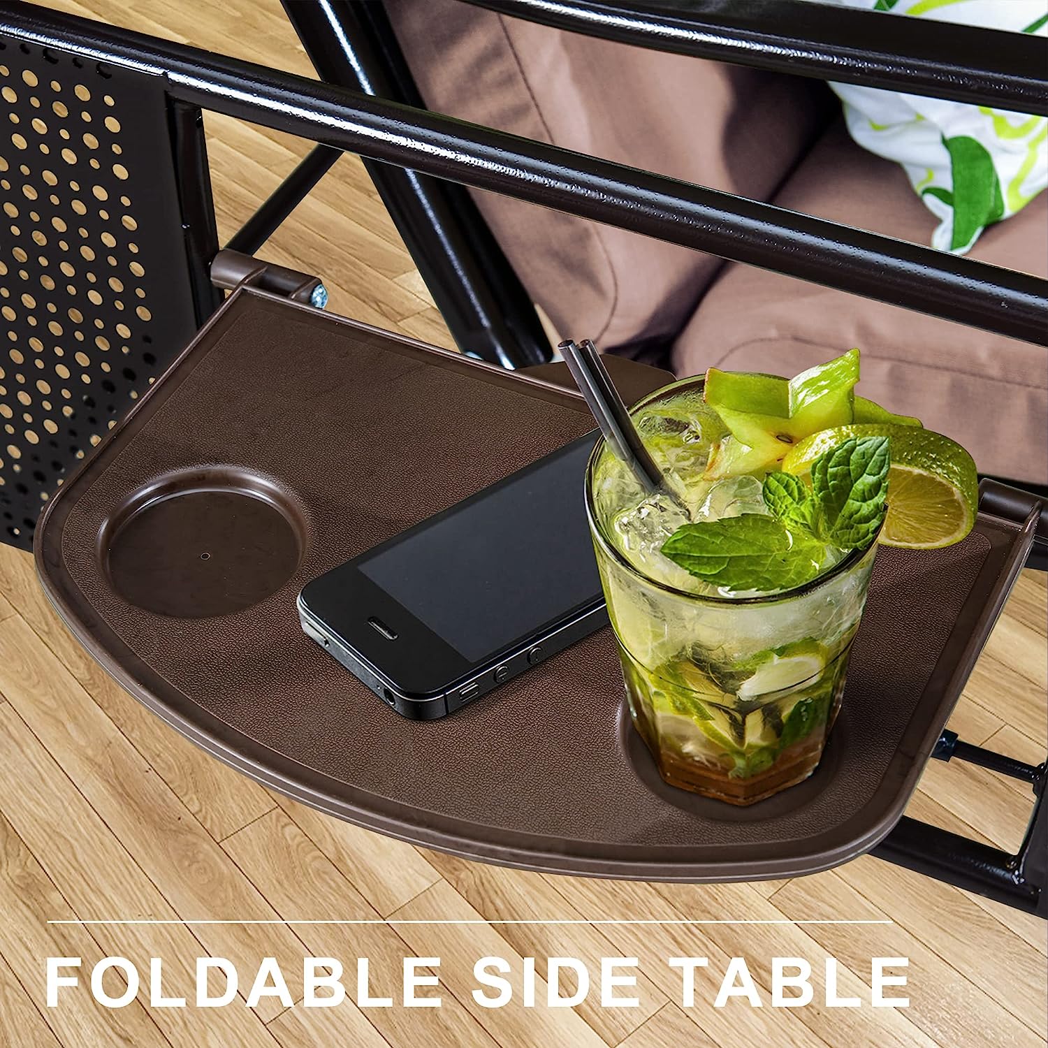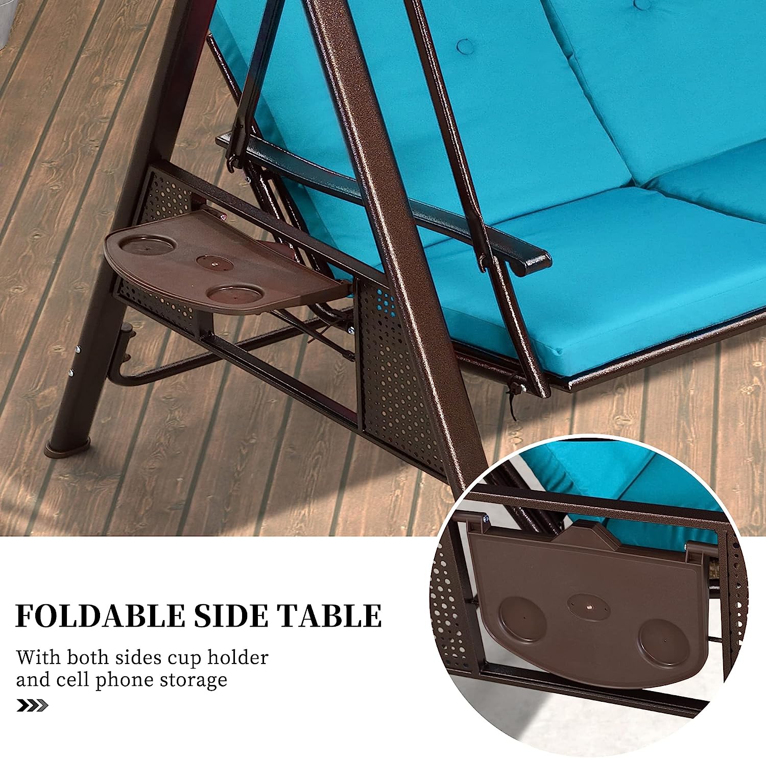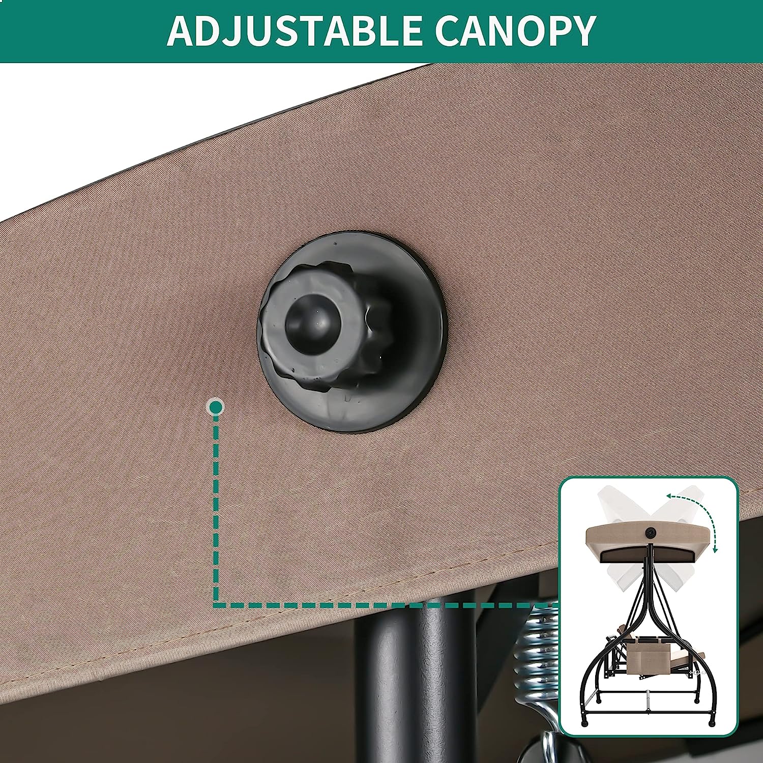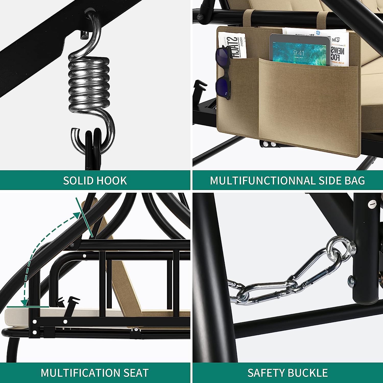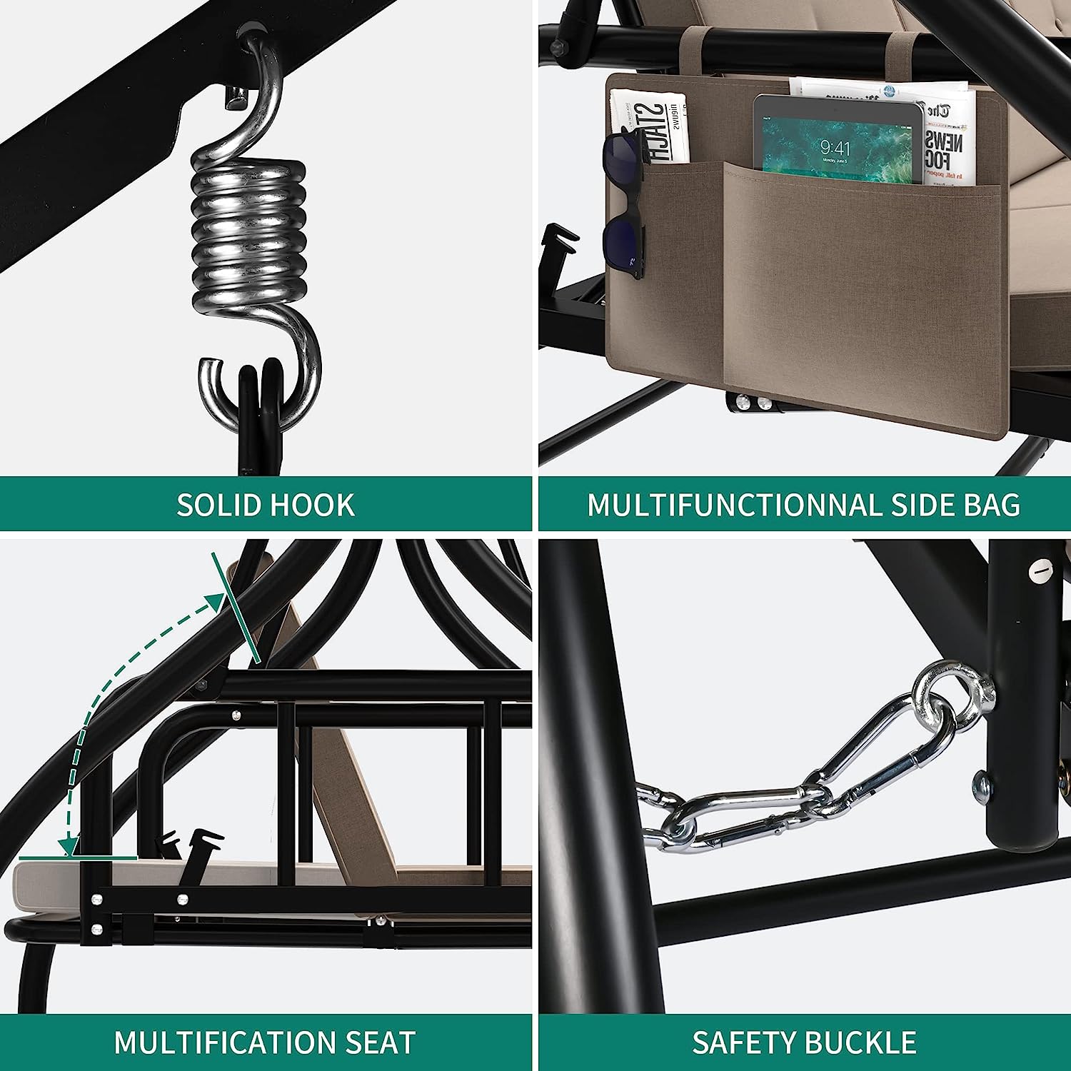 NOBLEMOOD Patio Porch Swing, 3-Seat Outdoor Swing with Adjustable Canopy, Thickened Cushion, Pillow and Foldable Side Tray for Patio, Backyard, Porch Swing Bed for Spring(Khaki)