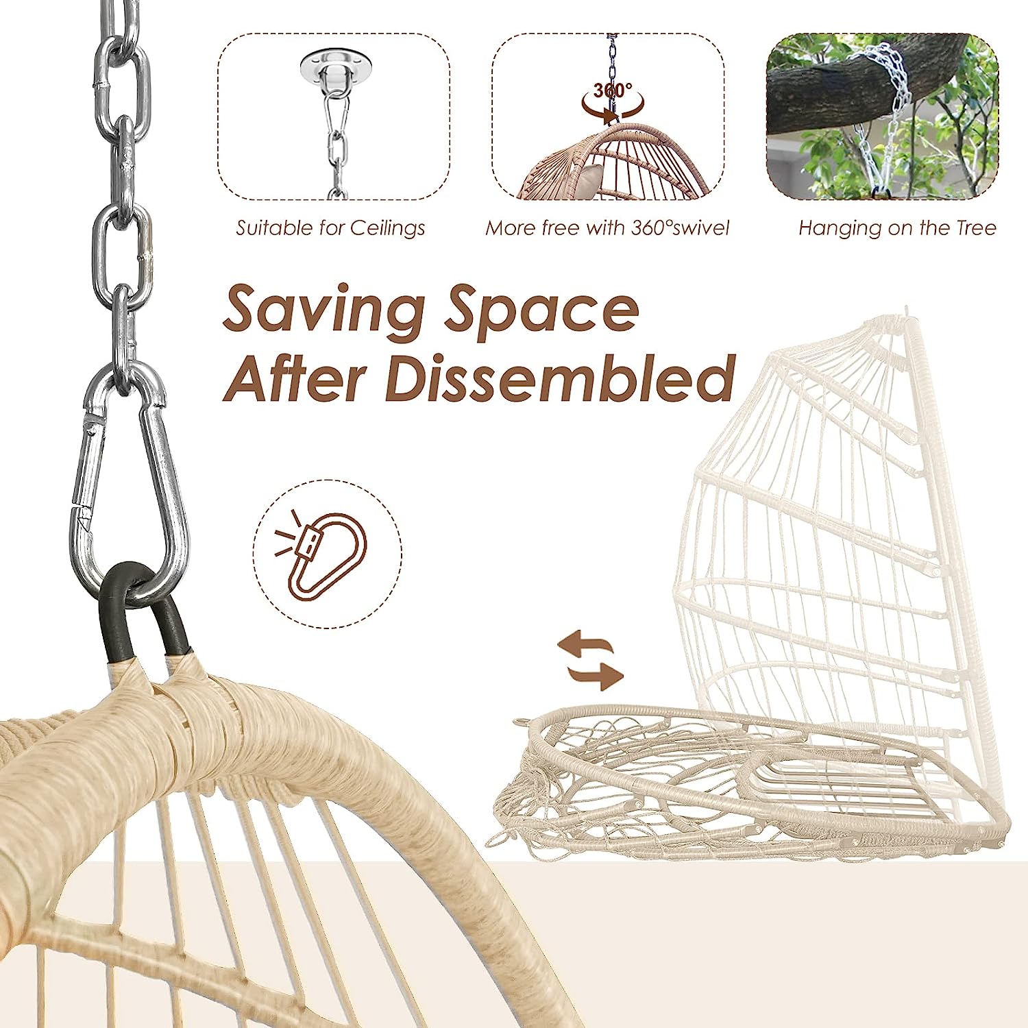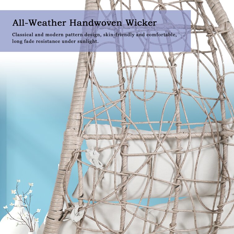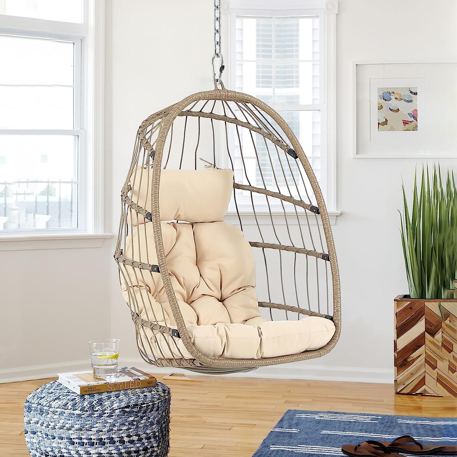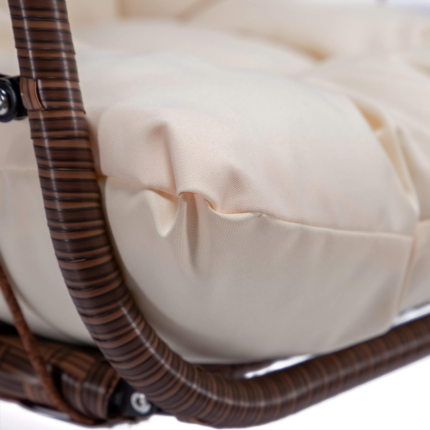in Door Outdoor Patio Wicker Hanging Chair Swing Chair Patio Egg Chair UV Resistant Beige Cushion Aluminum Frame (Brown)