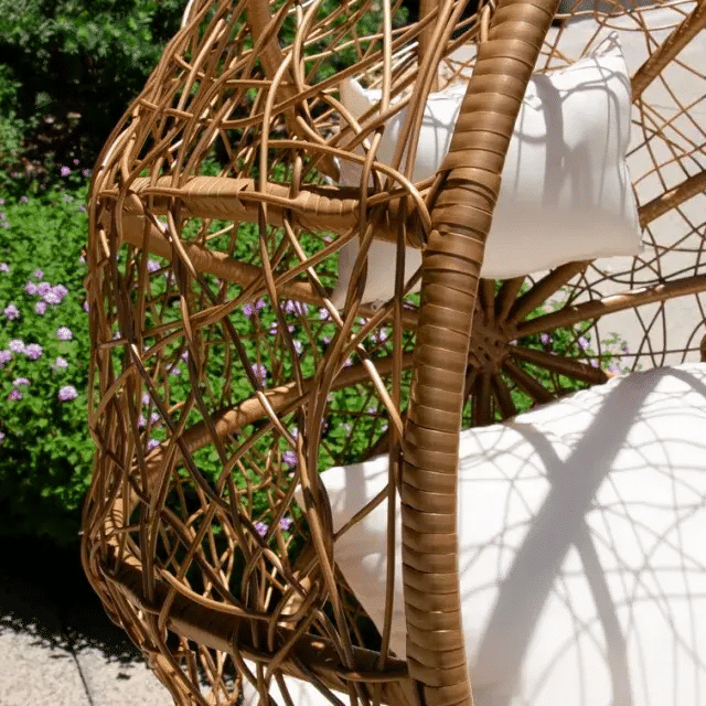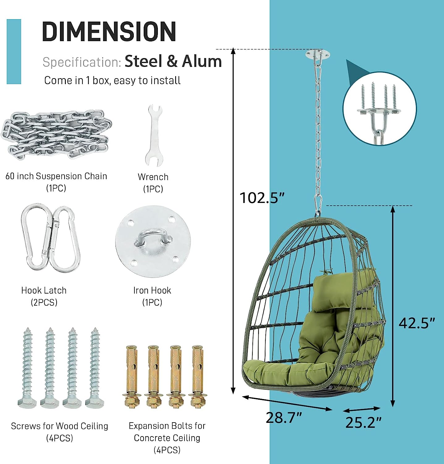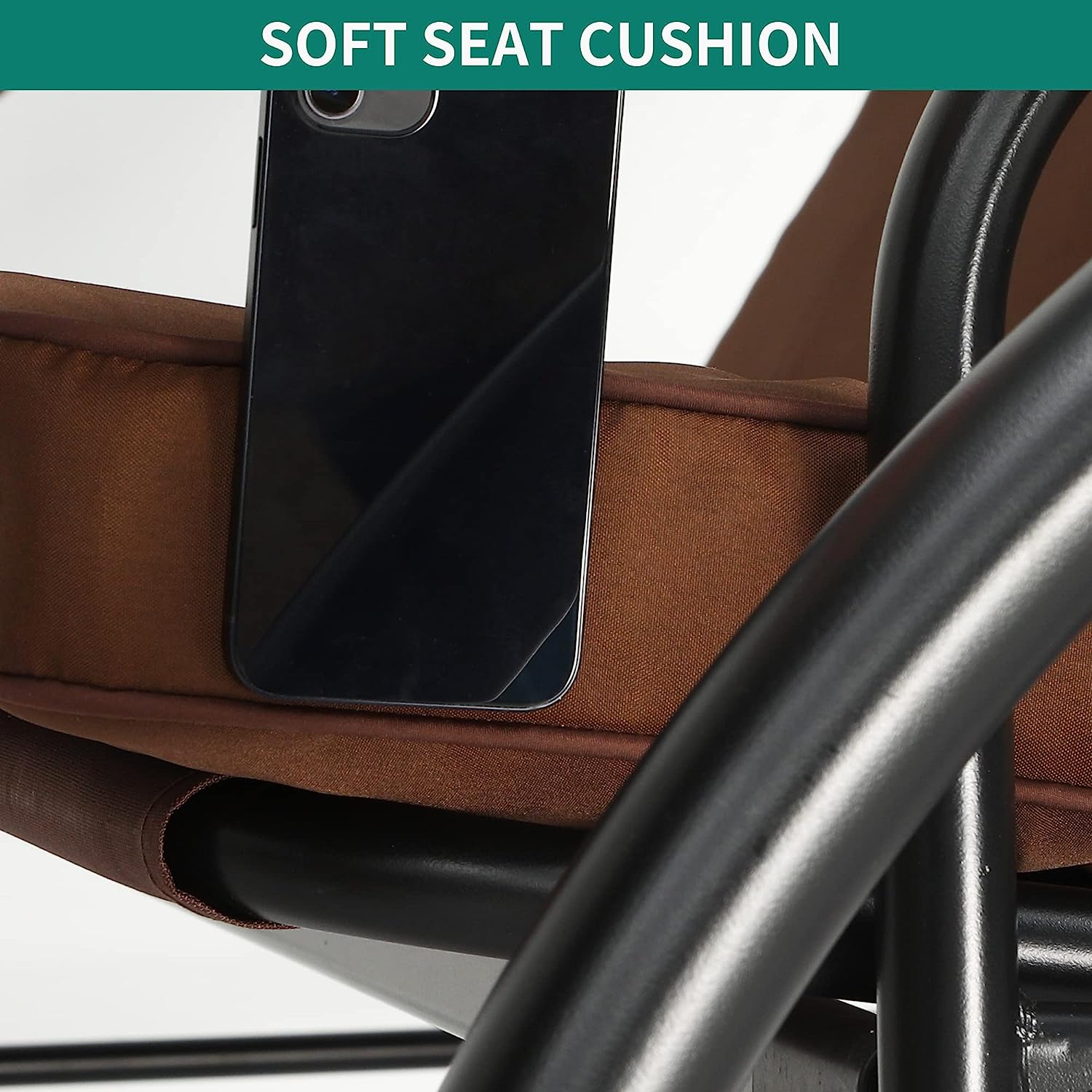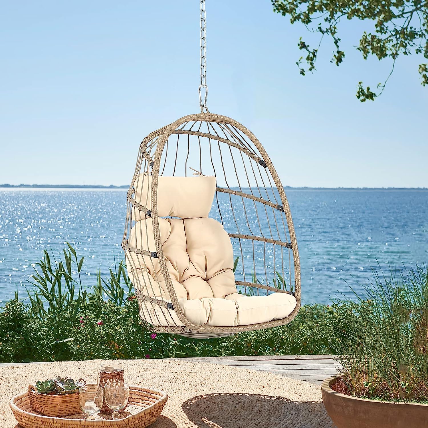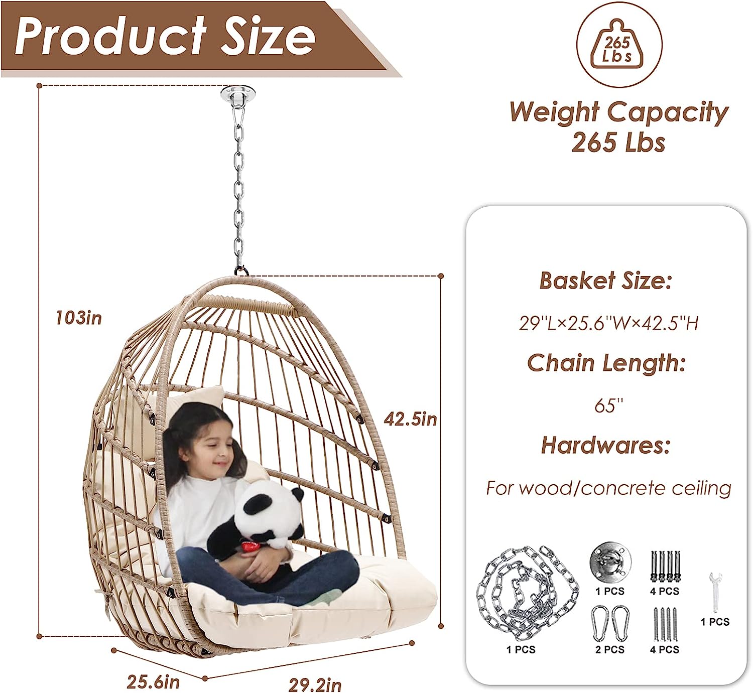 in Door Outdoor Patio Wicker Hanging Chair Swing Chair Patio Egg Chair UV Resistant Beige Cushion Aluminum Frame (Brown)