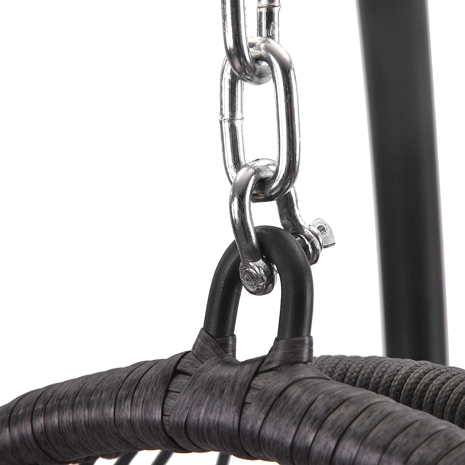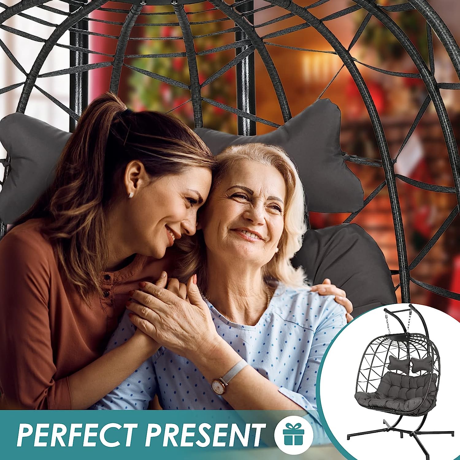 2 Person Hanging Egg Chair with Stand for Outdoor, Patio Hand Made Rattan Wicker Double Egg Swing Chairs Hammock Chair with UV Resistant Cushion and Metal Frame, Porch Swing Loveseat for Backyard
