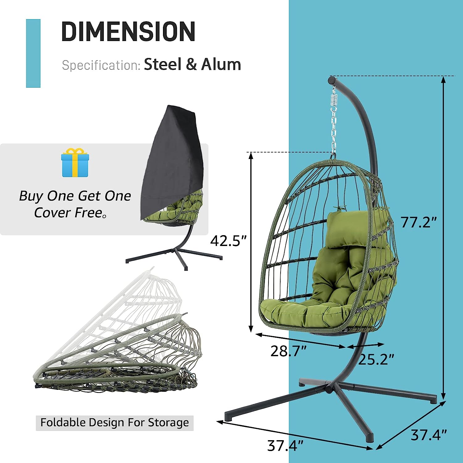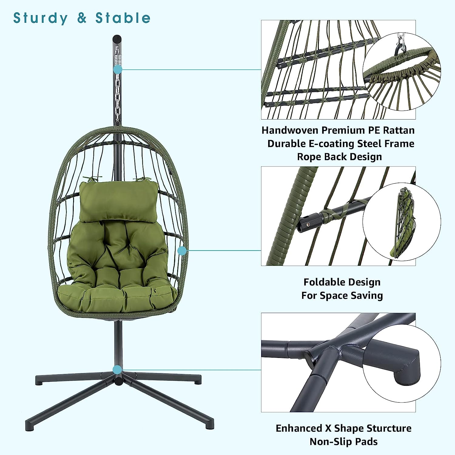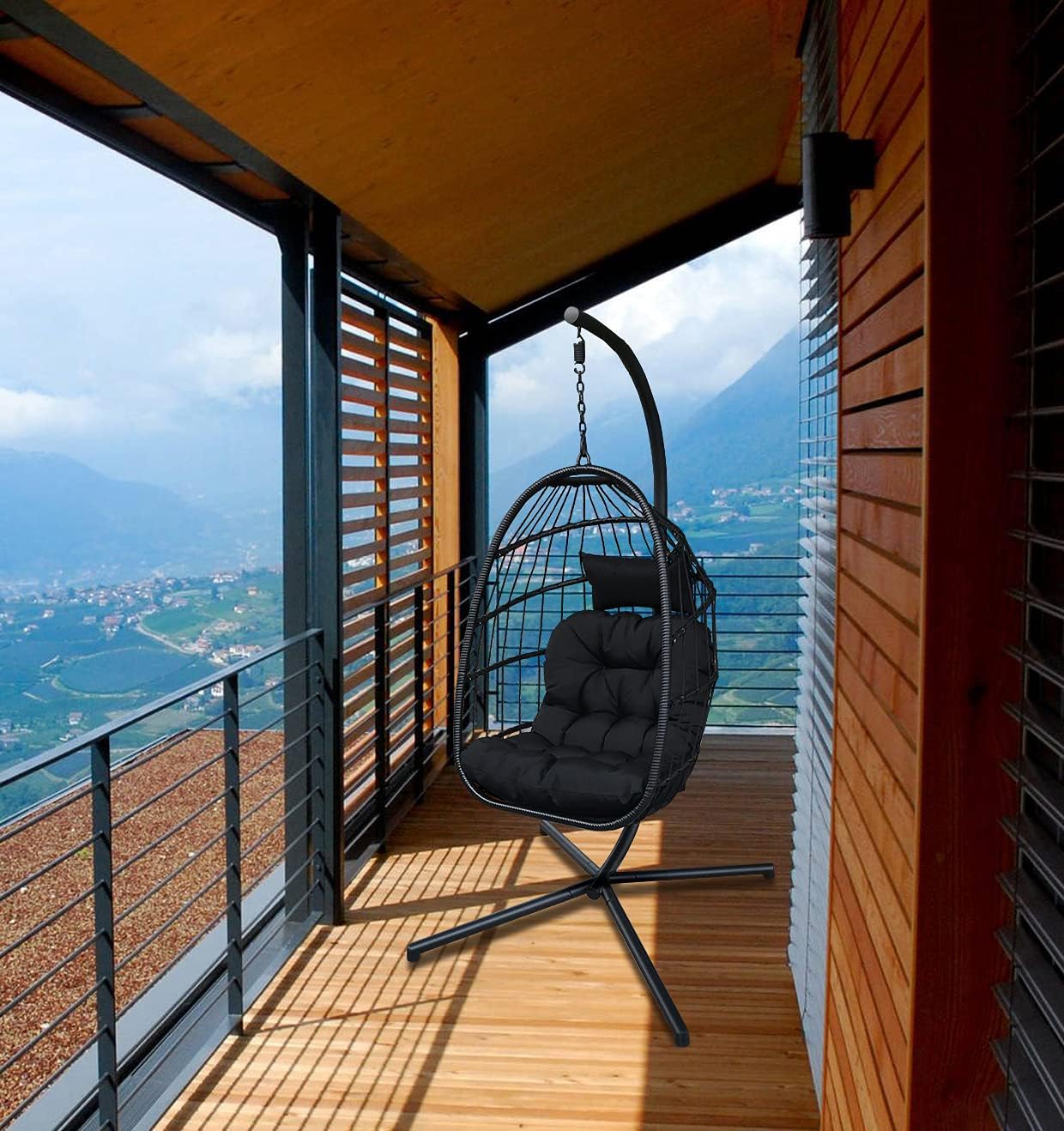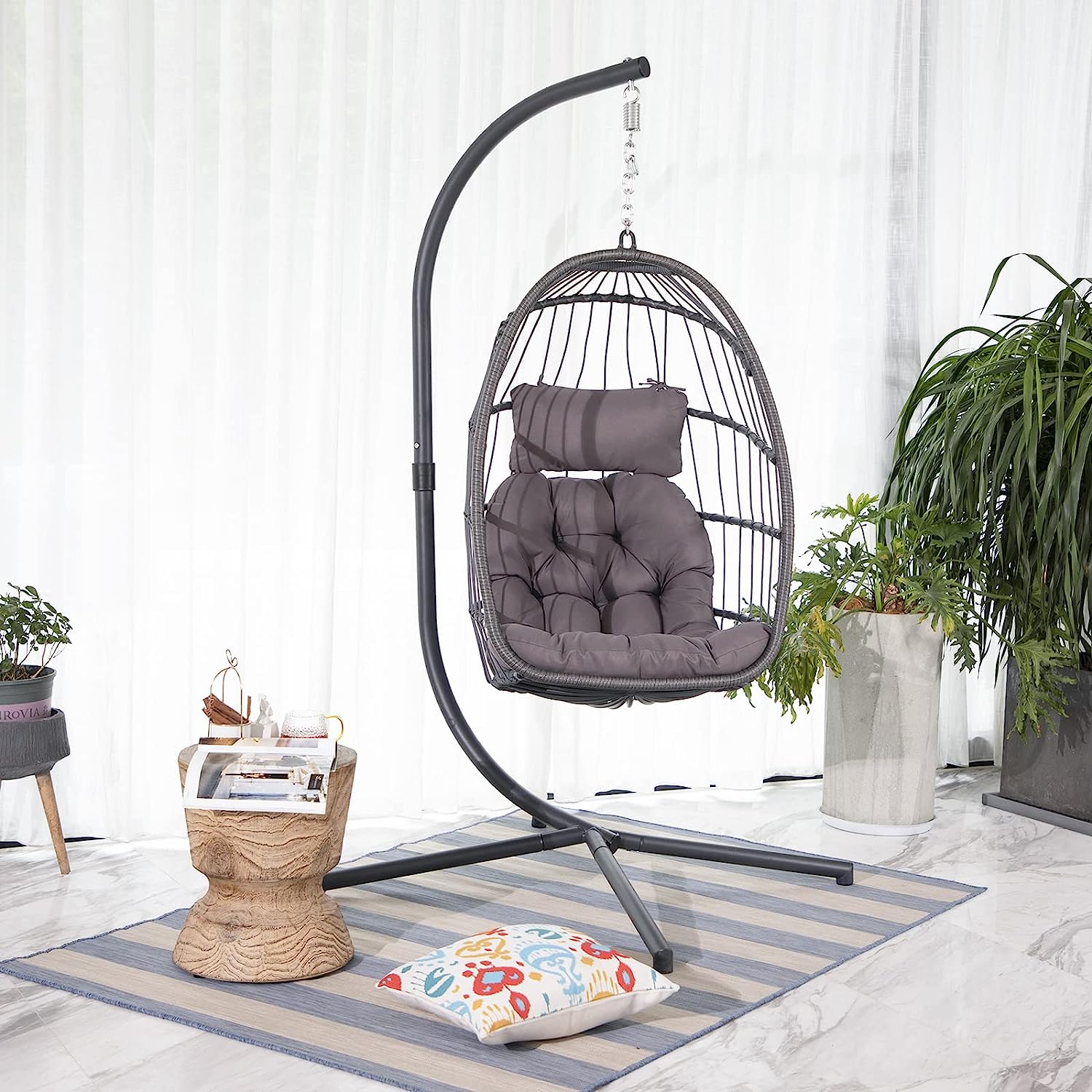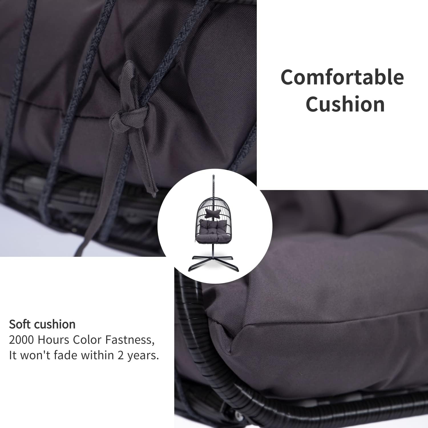 Foldable Swing Chair with Stand, Rattan Wicker Hanging Egg Chair Hammock Chair with Cushion and Pillow for Indoor Outdoor Bedroom Patio Garden (Dark Grey)